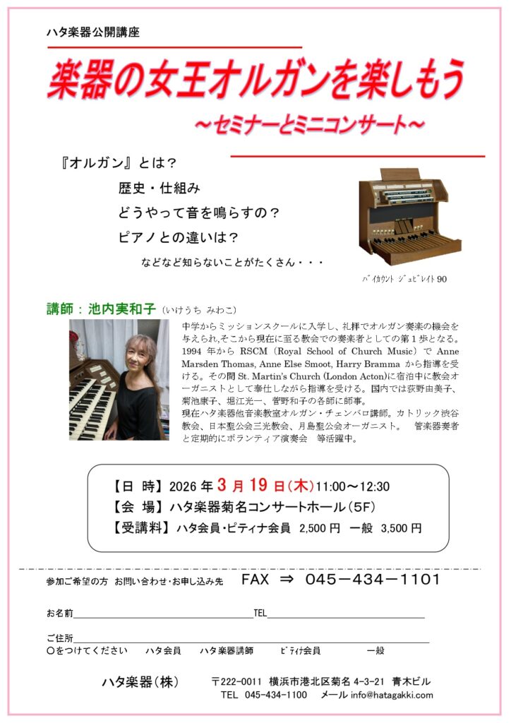 ハタ楽器オルガン講師池内実和子のオルガンセミナーとミニコンサートです 楽器の女王といわれるオルガンには秘密がいっぱい もっと身近に楽しめるようになります